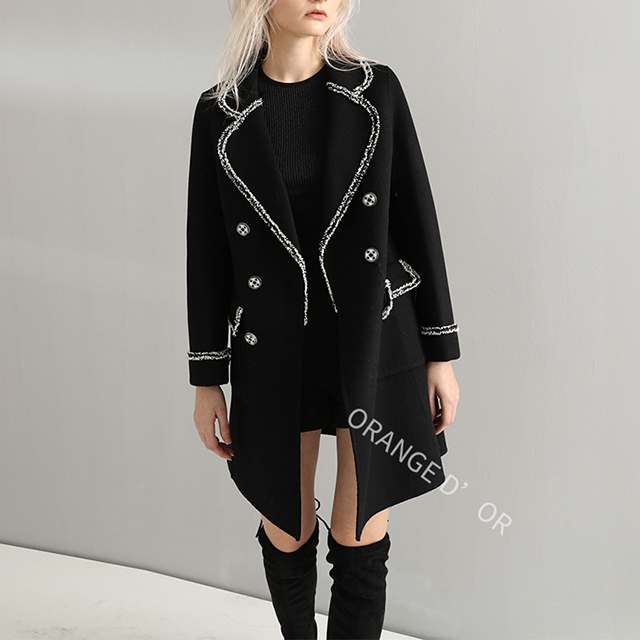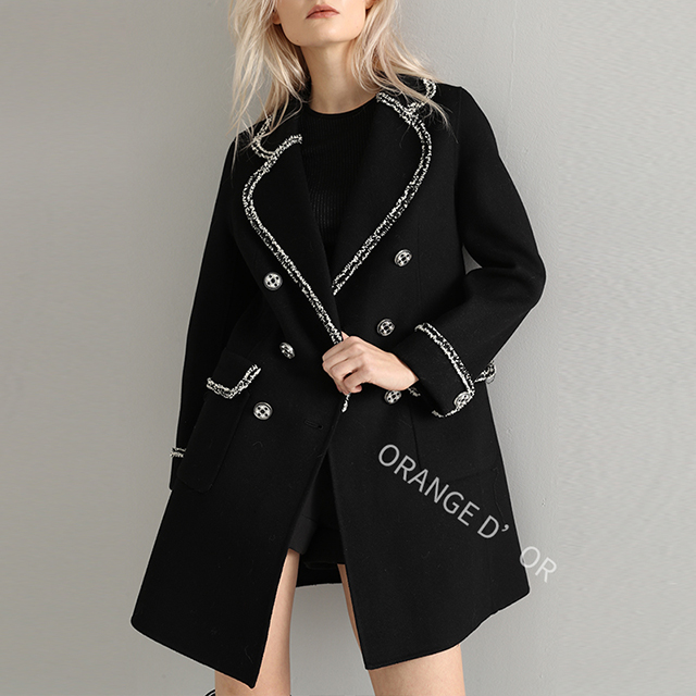 展品簡介:長款樣式,翻駁領(lǐng)領(lǐng)型,經(jīng)典雙排扣,雙側(cè)袋蓋式口袋設(shè)計,